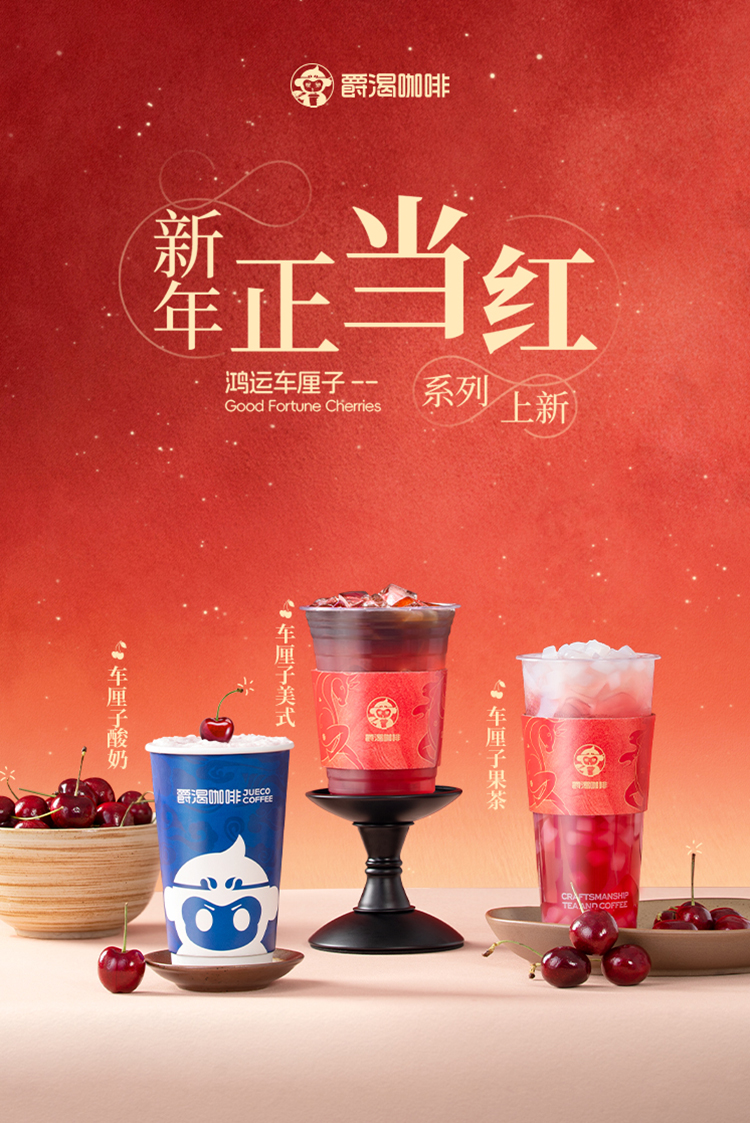 年关已至,爵渴希望通过这一杯「鸿运车厘子」饮品,为大家送上对新年的诚挚祝福。同时在新的一年里我们也将继续坚持聚焦在茶咖、果咖赛道,从品类、产品、口感等多方面创新,用心把控每一个环节,做更符合大众口味,好喝不贵的饮品咖啡品牌。